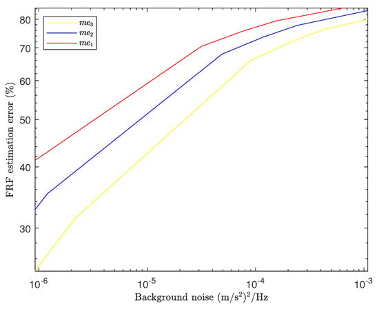 where is the shape error of the FRF obtained with background noise added to the response signal in the time domain, is the signal power spectral density, and N is a normally distributed random function []. The noise additions were calculated using Equation (8).