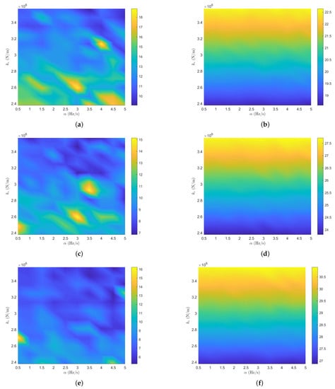 where the maximum peak-amplitude in the range from 1 to 51 Hz can be extracted by the ratio of Equation (6). The peak corresponding to the vibration mode n can be represented by three dynamic parameters, such as the frequency of the peak , the width of the peak , and the level of the peak []. The peak-amplitude method is used to experimentally find the dynamic stiffness and the damping coefficient of the mechanical system, because it assumes that the entire response can be attributed to a local mode, and that the effects due to the other modes can be ignored [].