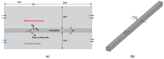The physical model of the flat-plated film-cooling is illustrated in Figure 2, consisting of the fluid and solid domains. The fluid domain includes the mainstream passage, the coolant feeding channel, and the connecting film-cooling holes. The hot air in the mainstream passage and the coolant in the coolant feeding channel both flow along the X-direction. The film-cooling holes studied all have a lateral pitch of t = 3D. The total streamwise length of the mainstream passage is 75D, with a distance ahead of the cylindrical hole exit of 25D. The mainstream passage, the flat plate, and the coolant channel have the same streamwise lengths and lateral widths. The heights of the mainstream passage and the coolant channel are 20D and 15D, respectively. The thickness of the solid flat plate is 3D. The original point is located at the hole exit of the CYL hole and is always kept the same for the other three cratered holes. The axis Z denotes the normal direction relative to the top wall surface of the flat plate.