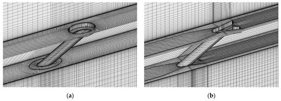 The computational grids are generated using the commercial package ICEM. The structured grids around the hole are shown in Figure 3 for the CIR_CRA and CRA1 models. The grid nodes aside from the fluid-solid interface are one-to-one matched to eliminate possible data transmission errors. The computational grids in the fluid domain are refined around the fluid-solid interfaces to resolve the boundary layer. The distance between the first node and the wall in the boundary layer is 0.001D. The corresponding value of Y+ is near 1.0. The stretching ratio of grids near the surface wall is 1.2. The grid independence tests are performed, and the grid levels are selected as approximately 3 million, considering the computation resource cost and the prediction accuracy.