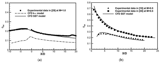The comparisons between the CFD predicted results and the literature data of laterally averaged cooling effectiveness are shown in Figure 4. The conjugate film cooling experimental data for the CYL hole from Zhang [29] at M = 1.0 is compared with the CFD results, shown in Figure 4a. The k-ε turbulence model remarkably under-predicts the experimental data of the CYL hole at M = 0.5. Comparatively, the predicted values of the SST turbulence model agree well generally, except for the slight undervaluation in the region 10 < X/D < 20. The reason mainly lies in the disagreement in the boundary condition at the front and back surfaces of the flat plate between the simulation and the experimental measurement. Because there is no conjugate heat transfer experimental data for the cratered film-cooling holes, the adiabatic laterally averaged cooling effectiveness ηlat for the CIR_CRA hole [10] and the CRA1 hole [30] at M = 0.5 are further used for validation. It is seen that the SST turbulence model also performs a good prediction accuracy for the CIR_CRA hole and CRA1 hole. Hence, the SST turbulence model is adopted to perform conjugate heat transfer simulations for the three types of film-cooling holes.
