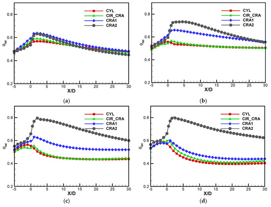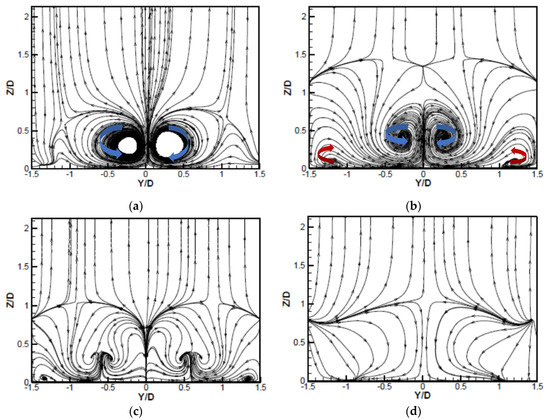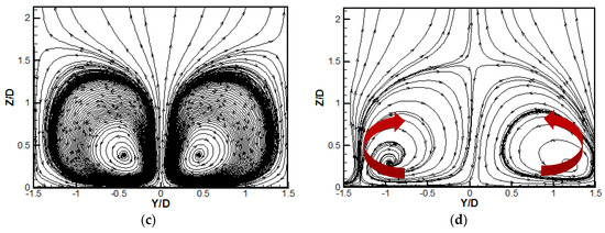 Streamline distributions over the surface X/D = 5 at M = 0.5. (a) CYL; (b) CIR_CRA; (c) CRA1; (d) CRA2.