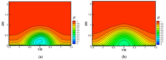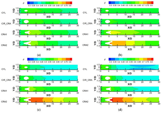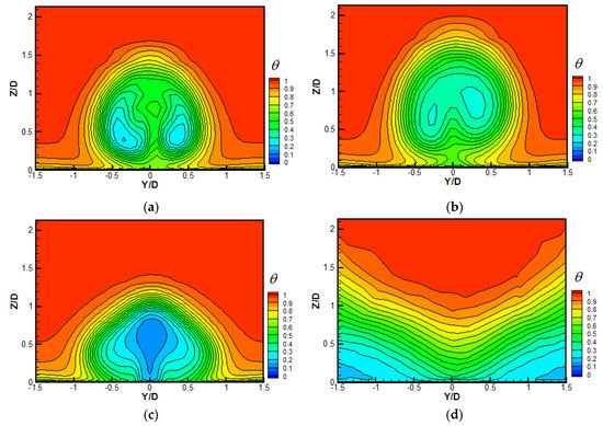 Contours of non-dimensional temperature over the surface X/D = 5 at M = 0.5. (a) CYL; (b) CIR_CRA; (c) CRA1; (d) CRA2.