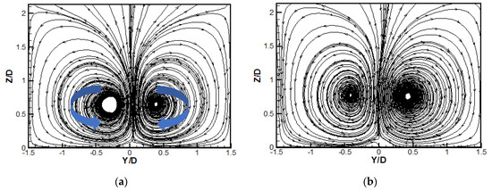 Figure 5 shows the streamline distributions over the surface X/D = 5 at M = 0.5 for the four film-cooling holes studied. The kidney-shaped vortex pair has a counter-rotating direction marked with blue color, and the anti-kidney-shaped vortex pair exhibits an opposite sense of rotation marked by dark red color. It is seen that the kidney-shaped vortex pair, generated by the mutual effect of the ejection coolant and the mainstream flow, dominates the flow field downstream for the CYL hole. Fric and Roshko [31] revealed that the kidney-shaped vortex mainly results in the coolant departure away from the wall surface and the cooling performance degeneration, especially at high blowing ratios. Because of the relative lower momentum of the ejected coolant at M = 0.5, the kidney-shaped vortex pair is still attached to the wall surface. For the CIR_CRA hole, the flow field consists of the original kidney-shaped vortex pair in the middle and a new anti-kidney-shaped vortex pair. The interaction between the elliptic crater and the ejected coolant induces the anti-kidney-shaped vortex pair, ventilating the coolant along the lateral direction. The flow structure is remarkably different for the contoured cratered holes. The greatest difference is that the original kidney-shaped vortex pair is almost eliminated, especially for the CRA2 hole.