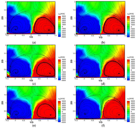 Streamlines and streamwise vorticities over the surface X/D = 5 with various heat conductivities at M = 1.5. (a) Bi = 0.026; (b) Bi = 0.065; (c) Bi = 0.13; (d) Bi = 0.26; (e) Bi = 0.65; (f) adiabatic.