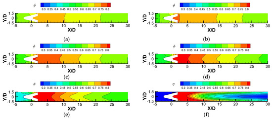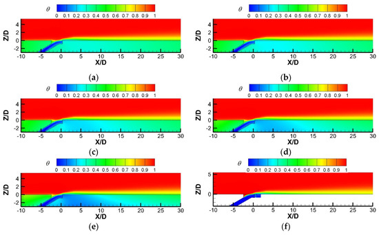 The contours of non-dimensional temperature over the surface X/D = 5 at M = 0.5 are shown in Figure 6. The coolant core is just above the wall surface for the CYL hole, and the coolant is attached to the wall surface. Because the additional anti-kidney-shaped vortex pair aside for the CIR_CRA hole has limited influence on the entire flow field, the non-dimensional temperature distribution is similar to that for the CYL hole. Compared with the CYL hole, the non-dimensional temperature contour shows a flat distribution, mainly attributed to the strong and large-scale anti-kidney-shaped vortex pair for the CRA1 and CRA2 holes. Comparatively, more coolants for the CRA2 hole are dragged sideways, and even non-dimensional temperature is distributed along the lateral span.