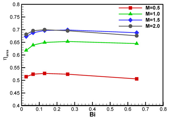 The influence of the Biot number on the area-averaged overall cooling effectiveness for the CRA2 hole is shown in Figure 15. It can be seen that the Biot number plays an insensitive role in the area-averaged overall cooling effectiveness for the CRA2 hole model. Despite the local overall cooling effectiveness distribution varies remarkably with the change of Biot number, shown in Figure 14, the area-averaged overall cooling effectiveness provides the absolute deviations of 0.022–0.035 relative to the Biot number at blowing ratios M = 0.5–2.0, and the relative deviations of 3.40–5.38%. The small variation of the CRA hole model with Biot number in the current study is similar to that of the fan-shaped hole model reportedin [29]. The area-averaged overall cooling effectiveness for the CRA2 model firstly increases, then decreases with the increment of the Biot number. The smallest Biot number at either blowing ratio also gives the lowest value of area-averaged overall cooling effectiveness, mainly due to the highest consumption of cooling capability in the upstream region ahead of the cooling hole. However, the changing trend for the CRA2 hole is different from the monotonically decreasing tendency for the CYL hole model in [27]. Hence, the general tendency of the Biot number for the film cooling hole is suggested to be analyzed case by case.