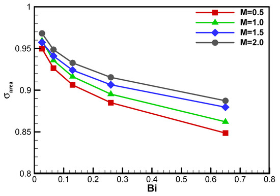 Figure 16 further presented the influence of the Biot number on the area-averaged overall cooling effectiveness uniformity coefficient for the CRA2 hole model at different blowing ratios. It is found that the Biot number provides a significant impact on the cooling uniformity coefficient σarea at either blowing ratio. For example, as the Biot number increases from 0.026 to 0.65, σarea decreases monotonously from 0.950 to 0.846 at M = 0.5. For the low Biot number configuration, the strong heat conduction effect evens the temperature distribution in lateral and streamwise directions, leading to a high value of σarea. Moreover, the increase of blowing ratio yields the increasing cooling uniformity coefficient σarea for either Biot number configuration, attributed to better coolant coverage over the wall surface for the CRA2 model.