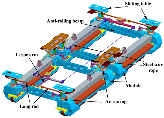 The running mechanism of a maglev train mainly includes suspension frame, secondary system, auxiliary steering mechanism, etc. to realize the functions of suspension, guidance and traction. The structure of running mechanism is shown in Figure 1. Therefore, the kinematic model can be built in two levels: suspension frame kinematics and secondary system kinematics. The left and right modules of the suspension frame are constrained by track and move along the track; its kinematics mainly analyze the movement of anti-rolling beams and hanger rods inside the same suspension frame [12]. The kinematic modeling of secondary system mainly analyzes the state of secondary system components between vehicle body and suspension frame when it moves along the track. This paper focuses on the kinematic modeling and analysis of a secondary system and a circular curve track.