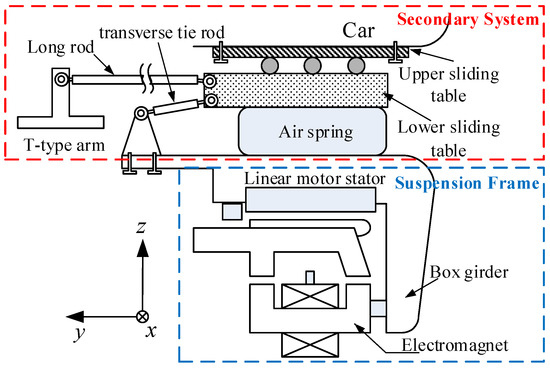 - The meaning of several structural parameters in Figure 7 is shown as follows:: The distance from the origin of track coordinate system and on the center line of the electromagnet pole surface to the axis of the air spring (direction of the reference system);: The vertical distance from the pole surface of the electromagnet to transverse tie rod (direction of reference system);: The lateral distance from the center line of the electromagnet pole surface to the joint of transverse tie rod seat (direction of reference system);: Length of transverse tie rod. The concept has been mentioned in kinematic modeling in Section 2;: The vertical distance from the end of transverse tie rod near the air spring to the upper sliding table (direction of the reference system).