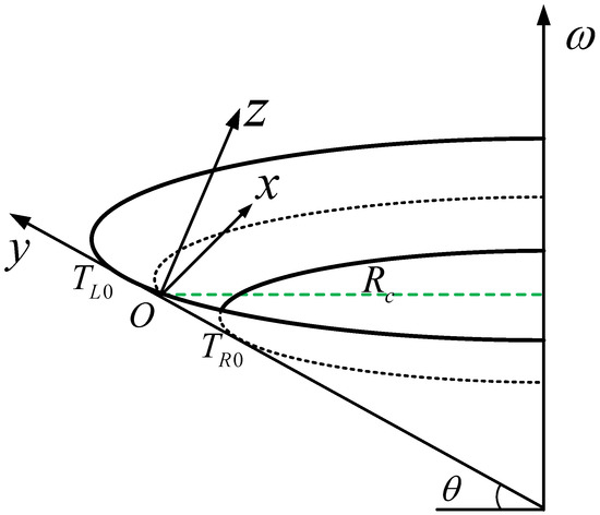 The circular curve has a constant radius and is a type of horizontal curve. The flat of circular curve track is a conical surface in space, which is generally described by two parameters: cross-slope angle and curve radius . From the perspective of the space, the centerline and inner and outer rails of circular curve are all plane curves. However, due to the existence of superelevation (cross slope angle ), a flat circular curve becomes a conical surface instead of a cylinder. Therefore, the circular curve track can be regarded as a conical surface with rotation axis passing through the center of the centerline and perpendicular to the ground. The generatrix length of the cone is with the angle to ground; the track is located on this conical surface. This spatial relationship of circular curves can be described by screw transformation. The sketch map of the circular curves track is shown in Figure 4.