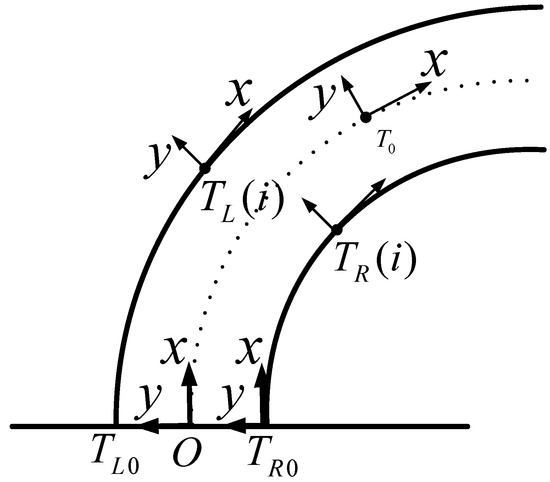 - Track starting point coordinate system and : The origins are located at the starting point of the right and left rail, respectively. Their poses are consistent with the reference coordinate system O and the distance from O is half rail-gauge. The pose of the moving coordinate system on the right running rail is consistent with .