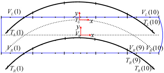 In Equation (21), is the track mileage at the midpoint of the electromagnet, and there are five points on the right side. Further, the pose matrix of relative to track origin coordinate is obtained as follows: