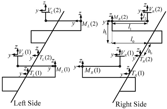 When the length of electromagnet l and the distance between adjacent magnets are known, the mileage s of the reference point on the track can be obtained. Further, the corresponding coordinate systems on the right side of the track and the corresponding coordinate systems are on the vehicle body; the origin of is set on the ith motion chain on the right side of the vehicle body, and the direction of coordinate axis is consistent with . The track reference coordinate system and the vehicle reference coordinate system can be defined. The origin of is located on the central line of the vehicle body. The x-axis is along the central line of the vehicle body and points to the positive direction of the vehicle body. The z-axis is perpendicular to the vehicle body plane, and the positive direction is upward. The y-axis is perpendicular to the vehicle body central line. These coordinate systems are shown in Figure 6.
