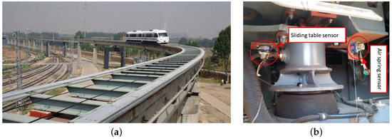 Test on circular curve. (a) Maglev train running on R100m circular curve on the Tangshan test line; (b) sensor for displacement test of sliding table and air spring.