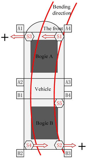 In order to verify the validity of kinematic modeling and its calculation results, a test of the motion of vehicle’s secondary system was performed on the Tangshan test line, and the motion of secondary system includes the movement of sliding table and air spring. The test site is shown in Figure 8a. The maglev train passed a circular curve with a radius of 100 m at a speed of 40 km/h under heavy load. Using the cable displacement sensor shown in Figure 8b, the moving distance of the sliding table and the height change of the air spring were tested. The layout of the measuring points is shown in Figure 9. The measuring point A4 in the figure corresponds to the right (inner) motion chain Number 1, where the displacement of the sliding table is measured by sensor S1; A3 corresponds to right motion-chain Number 2; B4 corresponds to right motion-chain Number 3, and the sliding table displacement is measured by sensor S5; B3 corresponds to right motion-chain Number 4, and the displacement of the sliding table is measured by sensor S2; A1 corresponds to left (outer) motion-chain Number 1, and the displacement of the sliding table is measured by S3; B2 corresponds to left motion-chain Number 4, and the displacement of the sliding table is measured by S4, and so on. The test results are shown in Figure 10.