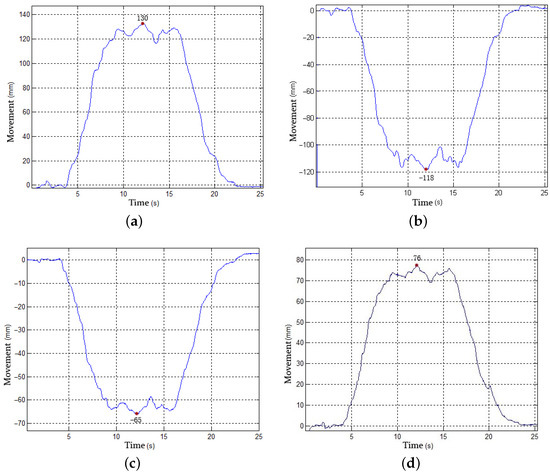 Test results. (a) Displacement curve of sliding table at A1; (b) displacement curve of sliding table at A4; (c) displacement curve of sliding table at B2; (d) displacement curve of sliding table at B3.