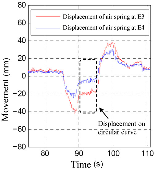 It can be seen from Table 5 that the displacement of the sliding table calculated by the kinematic model is basically the same as the displacement obtained by experimental testing, and the deviation value is caused by dynamic factors such as speed, load, track irregularity, etc., during vehicle running. The above experimental results verify the correctness of the mathematical modeling and theoretical calculation results. The displacement of the air spring is shown as Figure 11. The time period in the dotted line is the displacement curve of air springs at E3 and E4 when the vehicle is running on a circular curve; E3 and E4 correspond to Number 10 and Number 9 in Table 4, respectively. The displacement at E3 is about −16 mm and at E4 is about −4 mm, which is bigger than the theoretical values of −13.78 mm and −0.73 mm. The main reason is that the designed passing speed of the cirlular curve is 40 km/h, but it only reaches 35 km/h during the test, which leads to vehicle centrifugal force that is less than the gravity component.