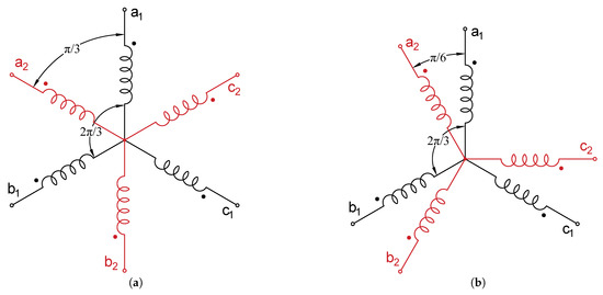 Figure 1. Schematic display of six-phase windings; (a) symmetrical configuration, (b) asymmetrical configuration.