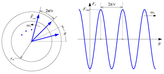 where f i is the frequency of the current harmonic component which generates the ν th spatial harmonic. It is important to distinguish the rotating frequency of spatial harmonics from the electrical frequency of the winding current. Note that ω ν can have a positive or negative value, depending on the harmonic order, with positive values corresponding to harmonics of the order 6 k + 1 ( k N 0 ), and negative values to harmonics of the order 6 k 1 . In other words, certain MMF harmonics may rotate in a direction opposite to that of the fundamental. The graphical representation of an arbitrary MMF harmonic distribution is given in Figure 2.