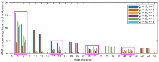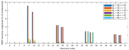 Before the mass implementation of PWM converters, the choice between the types of windings was guided by the criterion of eliminating sixth-order harmonics from torque ripples, which is caused by the presence of fifth and seventh stator MMF harmonics [21]. Particularly, the torque ripple is more pronounced in symmetrical six-phase windings, where circular currents of magnetic equalization are present [22]. Three-phase and symmetrical six-phase often require pitch shortening to suppress higher-order spatial MMF harmonics (most commonly of the fifth and seventh order). However, in doing so, the fundamental harmonic is reduced as well. For three-phase machines, the optimal winding pitch is in the range from 0.8 to 0.9 [14]. In the case of symmetrical six-phase windings, the desired value of winding pitch is most often 5/6 [24]. With the asymmetrical winding configuration, the harmonics of order 6 h ± 1 ( h = 1 , 3 , 5 ) are inherently eliminated, and there is often no need for winding pitch shortening to reduce the influence of higher harmonics. For this reason, the asymmetrical six-phase machine is the most common choice for high-power applications [23,25].