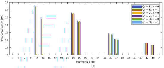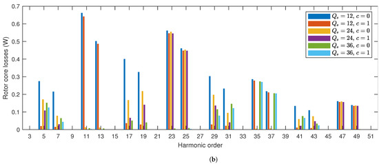 For the applications where the six-phase drive-group is designed, it is advisable not to use a three-phase machine as a starting machine, but rather to design a dedicated magnetic and electrical circuit. Moreover, with high-power machines, there is an even greater need for purposeful design of windings and magnetic circuit, because with power increasing it is important to reduce losses. Detailed analyses of the winding design methods and their influence on multiphase machine parameters are given in [20,25,26,27]. When designing the stator winding of a six-phase machine intended to operate at higher power frequencies, special attention should be paid to achieving a distribution of air-gap flux density as close as possible to the sinusoidal form. By doing so, the surface losses caused by higher spatial harmonics are reduced. There are not many papers on the topic of selecting the multiphase machine stator winding topology from the harmonic loss reduction standpoint.