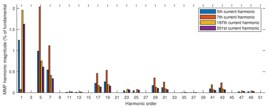 A review of the currently available literature shows that few papers deal with the harmonic losses in the rotor due to high-order stator MMF harmonics [7]. In particular, the dependence of the MMF distribution on the stator winding topology has already been studied in detail for three-phase machines and approaches for reducing or completely eliminating certain MMF harmonics are well known [13,14,30]. However, certain matters remain unresolved, especially in the field of multiphase machines. The specifics of MMF distribution in multiphase machines should be taken into account when choosing the winding configuration, which has been investigated for the 6PIM to a certain extent, as previously stated. However, the combined effect of particular MMF spatial harmonics at different current electrical harmonics on rotor losses is yet to be addressed in detail. Finally, certain current components of the 6PIM ( x y plane components) can lead to an increase in higher order MMF harmonics above values achievable in three-phase machines, and hence to higher harmonic losses.