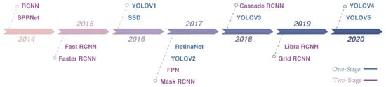 - Girshick, R.; Donahue, J.; Darrell, T.; Malik, J. Rich feature hierarchies for accurate object detection and semantic segmentation. In Proceedings of the IEEE Conference on Computer Vision and Pattern Recognition (CVPR), Columbus, OH, USA, 23–28 June 2014. [Google Scholar]