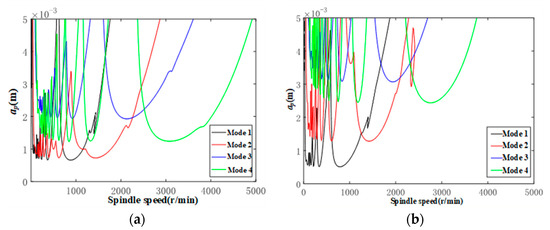 It is necessary to verify the correctness of stability lobes of helical milling based TriMule. The acceleration signals in the machining process are collected to time-frequency transformation to determine whether the machining process was unstable. As mentioned in Section 3.1, the correctness of the obtained stability lobes is verified, with Position 1 and Position 2 as examples. The combination of cutting parameters is shown in Table 7. The spectrum of experimental acceleration signal is shown in Figure 13.