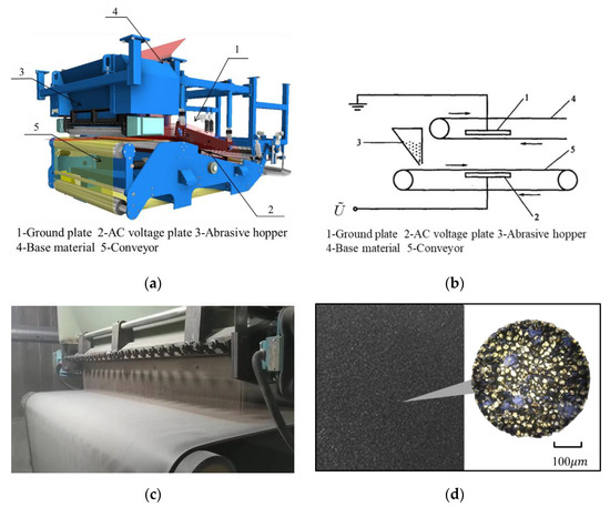 Industrial electrostatic abrasive planting: (a) abrasive planting equipment; (b) abrasive planting schematic diagram; (c) manufacturing site; (d) abrasive paper and its microstructure.