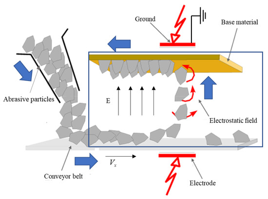 The electrostatic abrasive implantation process is shown in Figure 2. Firstly, the abrasive particles fall on the conveyor belt from the hopper and move forward with the conveyor belt at a uniform speed Vx. Next, the particles are charged under the action of the electric field after entering the electric field. Then, the charged particles fly upward under the action of the electric field force and enter the base material which coated with adhesive. After drying and other procedures, the sandpaper is finally formed.