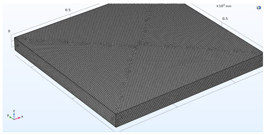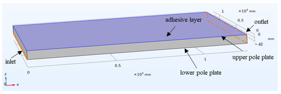 According to the effective size of the actual abrasive planting machine, a rectangular module of size 1250 × 1200 × H mm3 is constructed as the area between the upper and lower pole plates, where H ranges from 30 mm to 100 mm. An area of 1250 × 1200 × d mm3 is set as the adhesive layer below the upper pole plate, where d is the thickness of the adhesive layer and equals 0.25 mm. The adhesive layer area is also inside the electric field domain. The three-dimensional model is constructed as shown in Figure 4.