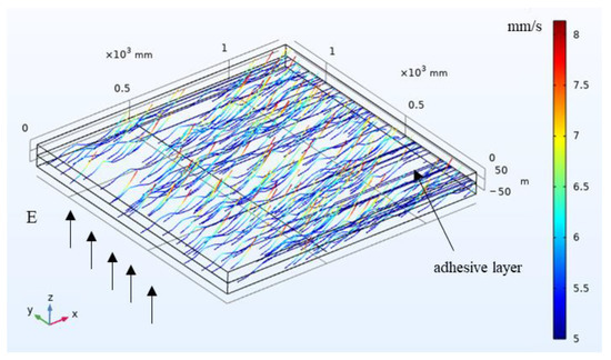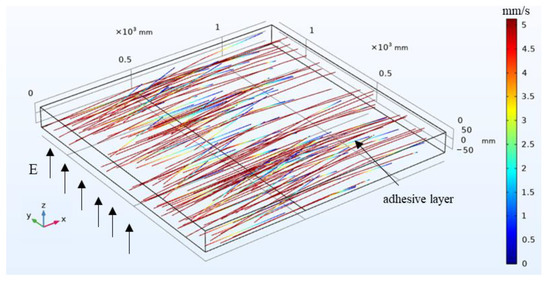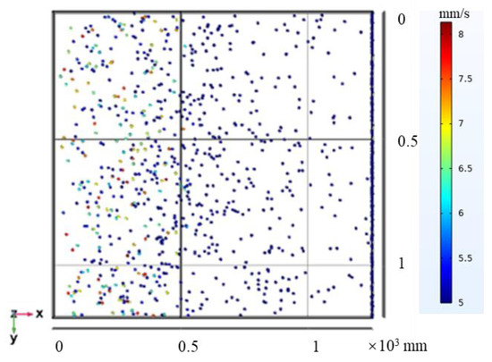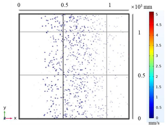 As shown in Figure 9, the number of particles distributed at the proximal end is larger and the number of particles distributed at the distal end is smaller. Most of the particles are directly embedded in the adhesive layer, the velocity is large, and they do not experience reciprocal motion. A small number of particles are detached after contacting with the adhesive layer, and some particles do not interact with the adhesive layer or the reciprocal motion in the electric field. This effect is consistent with the mechanical model, which means that the simulation is more reliable. Figure 10 shows the trajectory of particle motion simulated by the mechanical model, which reflects the state of particle motion as well as the location distribution and other characteristics. Figure 11 shows the particle cloud diagram in the adhesive layer of the field model. Compared with the mechanical model, the number of particles in the adhesive layer of the field model is smaller, and the position of the particles is farther in the x-direction.