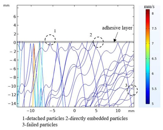 Observing the trajectory of abrasive particles, we can find that there are multiple particle motion states in the figure. In the first one, the particles can be embedded in the adhesive layer; in the second one, the particles reach the adhesive layer, but are not embedded in it; in the third one, the particles fluctuate inside the electric field and do not interact with the adhesive layer. The existence of these three cases shows that the mechanical model construction is close to the actual industrial process and shows that the model construction has some scientific validity.