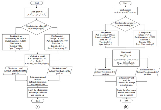 The flowcharts of the mechanical model and the field model are shown in Figure 12. These flowcharts show how the conduct the simulation experiments. As for the mechanical model, the force-motion equation of the particles is established firstly. Then, for different voltages and pole-plate spacing the trajectory of the particles is solved. The sand implantation rate is calculated according to whether the final position of the particles is within the pole-plate range. As for the field model, the action of the flow field on the particles is considered in addition to the action of the electric field, and the electric field, flow field, and particle motion models are coupled in COMSOL Multiphysics. Finally, the simulation results of the mechanical and the field model are compared with the real experiment results.