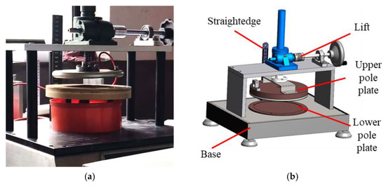 The electrostatic abrasive planting measuring equipment is shown in Figure 13. The diameter of the electrode plate on the machine is 100 mm, the pole plate spacing can be adjusted in the range of 20 mm–120 mm, and the voltage range is 0–60 kV. This equipment is used to verify the optimal parameters of voltage and plate spacing in the electrostatic abrasive planting. The upper pole plate height is adjustable and a weighing module installed in the lower pole plate. The abrasive planting effect is generally evaluated by the implantation rate :