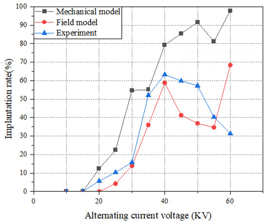 In most cases, the field model has more accurate results and has the same trends as the experimental data. The implantation rate of the field model and the real experiment is lower than the mechanical model. Firstly, the field model takes the ionization effect of the high voltage pole plate on the flow field during the actual experiment into consideration. The charges in the air will form the opposite electric field, which leads to the actual electric field force on the particle is less than the theoretical value. Secondly, due to the perturbation of the flow field, the field model particles are subjected to greater resistance. Thirdly, the rotation and flip of the particles. In a word, compared to the mechanical model, the particles of the field model have longer fly time between the pole plate due to the smaller combined force in the vertical direction. Fewer particles reach the upper pole plate and the implantation rate is lower, which is more consistent with the experimental results.