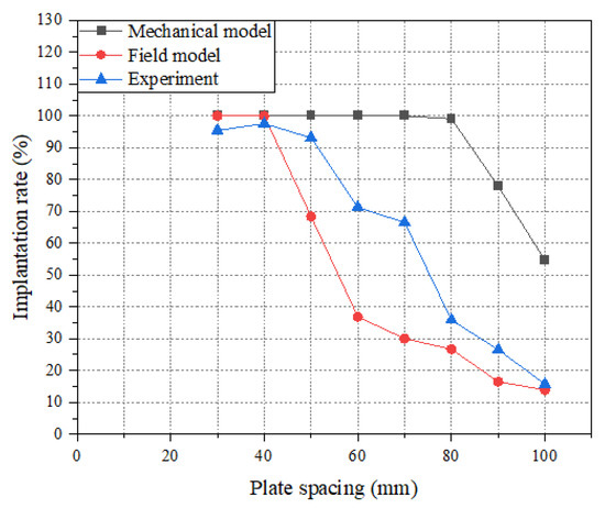 As shown in Figure 15, under different plate spacing the results of the field model are also closer to the actual experiments. For the field model, the implantation rate decreases when the plate spacing is larger than 40 mm. For the mechanical model, when the pole plate spacing is small (i.e., the pole plate spacing is 30–70 mm), all of the abrasive particles can be directly embedded into the adhesive layer, and the abrasive implantation rate is up to 100%. When the pole plate spacing continues to increase, the abrasive particles will carry out simple harmonic motion inside the electric field and will not enter the adhesive layer. which leads to the continuous decrease of abrasive implantation rate.