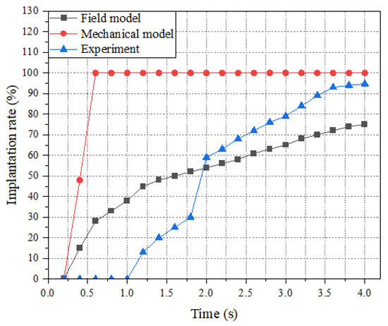 Implantation rate is one of the most effective indicators. The variation of the implantation rate with time in the sand implantation progress is shown in Figure 16. The voltage is 30 kV of 4 Hz and the plate spacing is 50 mm. For the mechanical model, the experimental abrasive implantation rate starts to rise only after the voltage reaches the starting voltage, and then its abrasive implantation rate rises rapidly and reaches 75% in a short time, and then the abrasive implantation rate reaches 100% in the completion stage. The field model starts slowly and there are certain fluctuations in the abrasive planting process with a final abrasive implantation rate of only 75% in the completion stage.