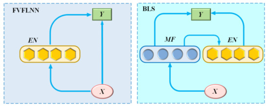 BLS is a novel learning method proposed on the basis of a random vector functional-link neural network (RVFLNN) [35,36]. It does not require a time-consuming training process and has a strong function approximation capability. The structure diagram of RVFLNN and BLS is shown in Figure 1.