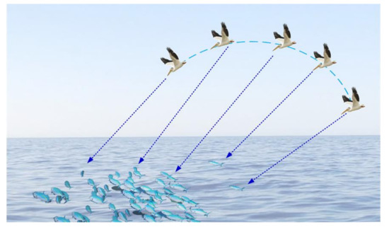 - Moving towards prey: In this phase, the pelican identifies the prey’s location and then rushes to the prey from a high altitude as shown in Figure 3. The random distribution of the prey in the search space increases the exploration ability of the pelican, and the update of the pelican’s location during each iteration is described as