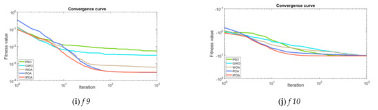 The convergence curve of the f 1–f 10 functions is shown in Figure 4: the red line denotes the IPOA algorithm, and the blue line represents the POA algorithm. It implies that the fitness value of the IPOA algorithm is lower and the convergence speed faster than other algorithms.