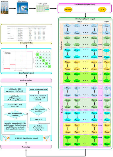 In this paper, in addition to the chaotic map strategy, the dynamic weight factor strategy was also used to improve the location of the standard pelican optimization algorithm in the initialization and moving towards prey stage; this helps to enhance the exploration of the improved pelican optimization algorithm technique. To improve the classification accuracy of the broad learning system model, the experimental data were normalized and the improved pelican optimization algorithm was used to optimize hyperparameters such as the number of feature nodes , number of enhancement nodes , and number of mapped feature layers . Performance indexes, classification accuracy, a classification results diagram, and confusion matrices fully demonstrate the excellent performance of the proposed classification model and verify the classification effect. The proposed model is very suitable for wind turbine fault classification in future practical applications.