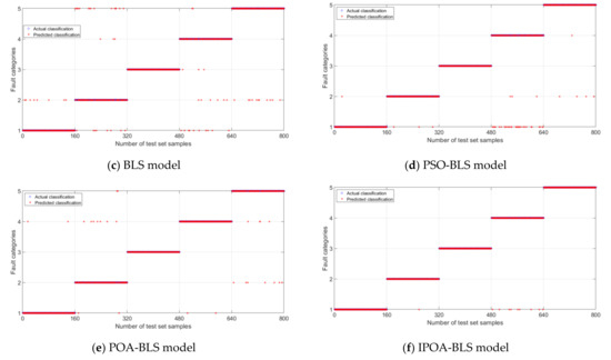 In order to state the advantages of the IPOA-BLS model in fault diagnosis, the classification results were compared with SVM, DBN, BLS, PSO-BLS, and POA-BLS diagnostic models. The classification results of each model are shown in Figure 6. In Figure 6, the blue circle (○) and red star (✲) mean the actual and predicted classification of the testing set samples, respectively. The blue circles and red stars overlap each other when the actual and predicted values of the classification are equal. If they are different, the blue circle and the red star do not overlap. The more overlapping means the fault resolution of the model is higher. In Figure 6a, the blue circle and red star overlap less, and the classification effect of the SVM model plays worse. In Figure 6f, the red star and the blue circle overlap each other the most times, which indicates that the IPOA-BLS model has the best classification effect.