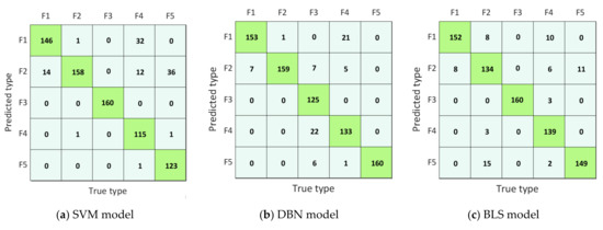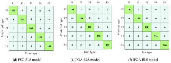 In Figure 7a, the SVM model can only accurately classify fault-F3. In total, 14 samples originally belonging to fault-F1 were misclassified as fault-F2. Two samples originally belonged to fault-F2; however, one of them was misclassified as fault-F1, and another one was misclassified as fault-F4, respectively. Altogether, 45 samples originally belonged to fault-F4; however, 1 of them was misclassified as fault-F5, 12 of them were misclassified as fault-F1, and 32 of them were misclassified as fault-F1, respectively. In total, 37 samples originally belonged to fault-F5, but 1 of them was misclassified as fault-F4, and 36 of them were misclassified as fault-F2, respectively. In Figure 7f, the IPOA-BLS model almost accurately classified fault-F1, fault-F2, fault-F3, and fault-F5. Only nine samples originally belonging to fault-F4 were misclassified as fault-F1.