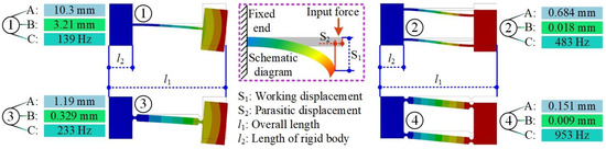 Comparison of transmission modules. A denotes the working displacement; B denotes the parasitic displacement; C denotes the first mode of beams.