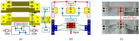 During the literature review, we observed that Gandhi et al. proposed an assembly guideline for flexure-based mechanisms [27]. However, the fastening force variation on the bolts deteriorate positioning precision due to the warping deformation of the flexible beam. To prevent this phenomenon, these standard interfaces are arranged in rigid parts on each module (as shown in Figure 5a). Simulations of assembled double-beam transmission modules are depicted in Figure 5b,c. With regard to the simulation results, the deformation of the guiding mechanism mainly appears in compliant beams. Thus, it can be regarded as a monolithic mechanism, without affecting the performance of the flexure beam.