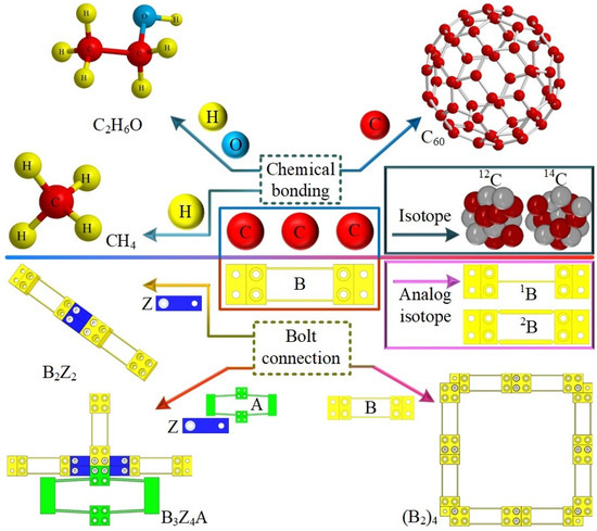 As mentioned above, one of the benefits of using modular architecture is that it can provide a variety of configurations. Assembling a modular MPS is similar to composing a molecular structure, as depicted in Figure 7. Regarding carbon atoms, many inorganic and organic compounds can be composed with hydrogen and oxygen atoms by chemical bonds. Meanwhile, regarding the designed modules with a standardized interface, such as transmission modules, many flexure-based components can be assembled by bolt connections. The C60 is realized by connecting carbon atoms, as for (B2)4. Furthermore, with the difference between 12C and 14C in physical properties, 14C has been widely used in isotope labeling tasks. Meanwhile, the static and dynamic performance can be adjusted by changing transmission modules from B to 1B or 2B. Furthermore, in order to validate the flexibility of the modular method, one-DOF, two-DOF, and three-DOF MPSs are assembled using the aforementioned designed modules.