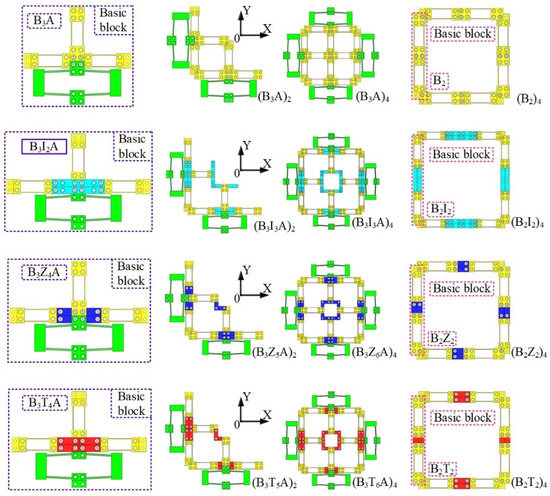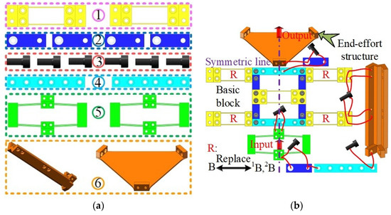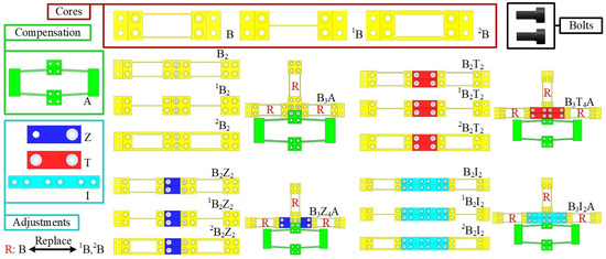 In practical experience, neither molecules nor modular MPSs can be arbitrarily composed of atoms or modules; they require guidance for combination or assembly. Several one-DOF MPSs with guiding functions are assembled using different modules, as shown in Figure 8. Firstly, the function adjustment of one-DOF MPS can be achieved by the replacement of B, 1B, or 2B. The resolution and motion range are two contradicting indices for PZA-actuated MPS, but this issue can be solved effectively by modular MPSs. For example, the motion range can be enlarged by reconfiguring B2 to B3A to compensate for the PZA displacement with an amplification module; vice versa, the resolution can be enhanced for B3A by removing the amplification module.