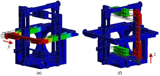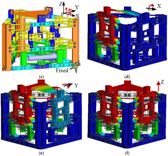 In addition, the 3D model of Zθ × θy MPS is shown in Figure 11c. When the outputs in three directions are same, the stage can realize translational motion along the Z direction, as shown in Figure 11f, and the stage rotates around the X or Y axis for different output modes, as shown in Figure 11d,e.